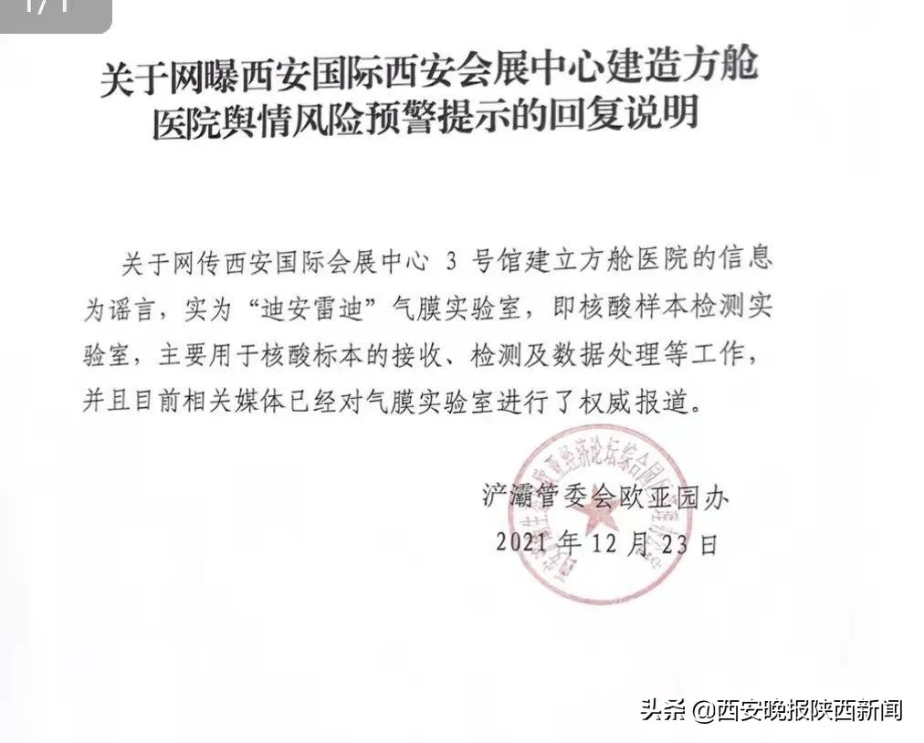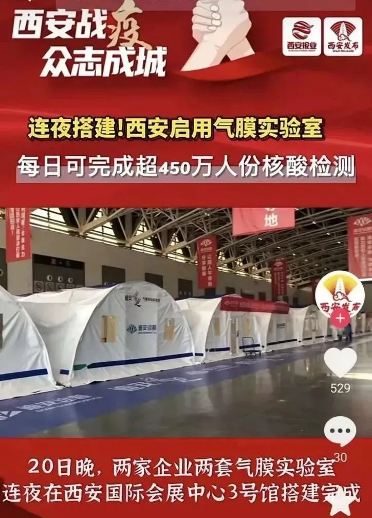 近日,短視頻平臺有網(wǎng)民發(fā)視頻稱“西安國際會展中心正在建方艙醫(yī)院”,經(jīng)核實,該信息為謠言,實為“迪安雷迪”氣膜實驗室,用于核酸檢測工作。