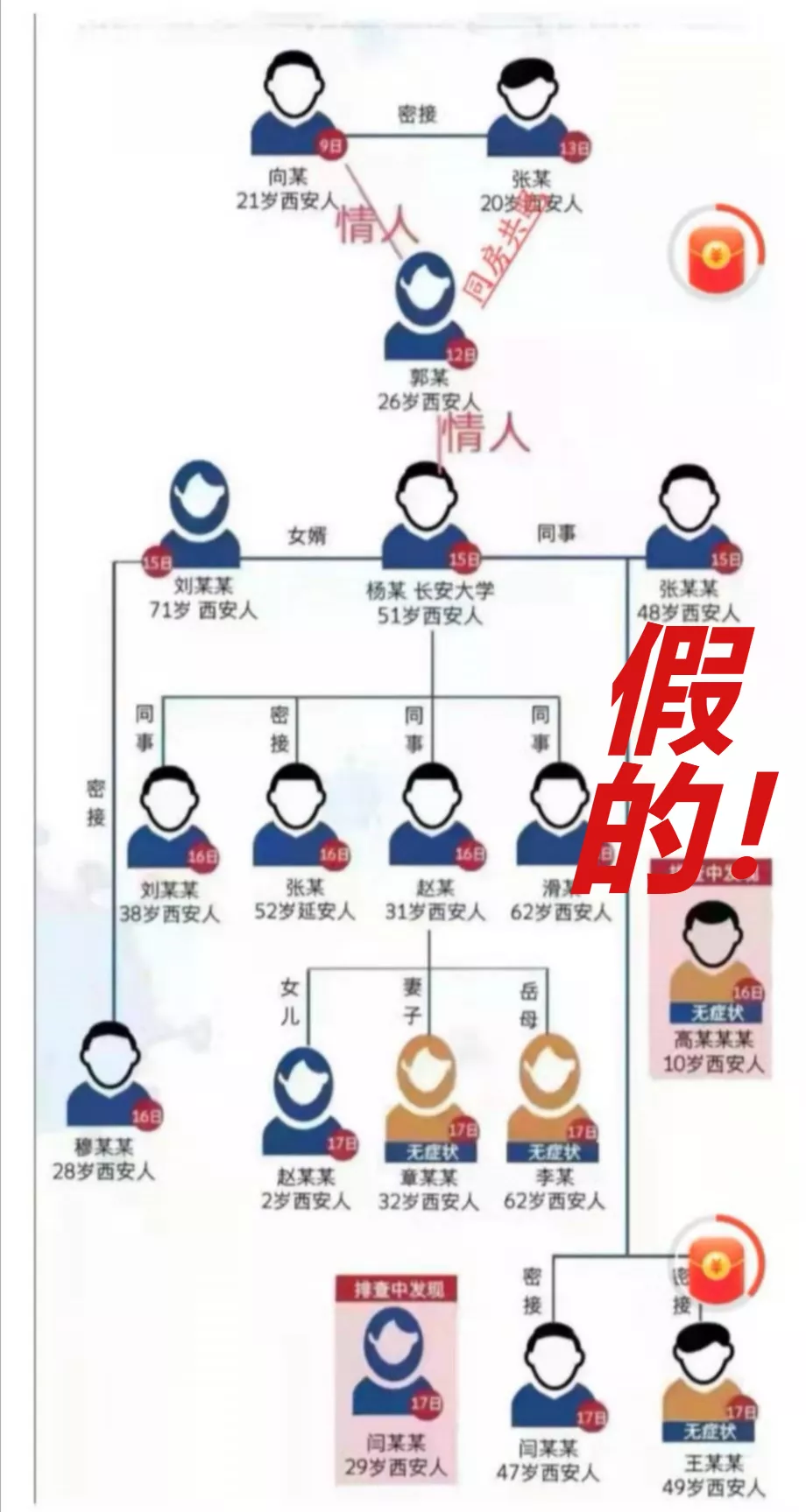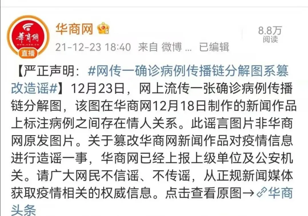 網(wǎng)上流傳一張確認病例傳播鏈分解圖,在病例之間標(biāo)注“情人”關(guān)系,并傳言此次疫情傳播因素之一,是因為西安首例病例與子牛門診的護士為情人關(guān)系,導(dǎo)致疫情擴散,經(jīng)核實,該圖盜用華商網(wǎng)12月18日制作的新聞作品圖片。該信息為虛假信息,造謠的人已被拘留。