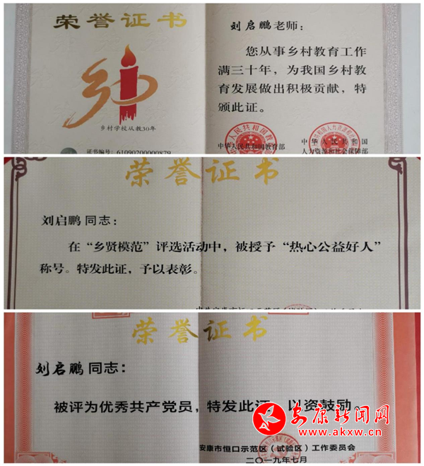 劉啟鵬先后獲得教育部、人力資源和社會(huì)保障部授予“鄉(xiāng)村學(xué)校從教30年”榮譽(yù)證書(shū),被區(qū)鎮(zhèn)評(píng)為“鄉(xiāng)賢模范”和“優(yōu)秀共產(chǎn)黨員”等先進(jìn)個(gè)人。