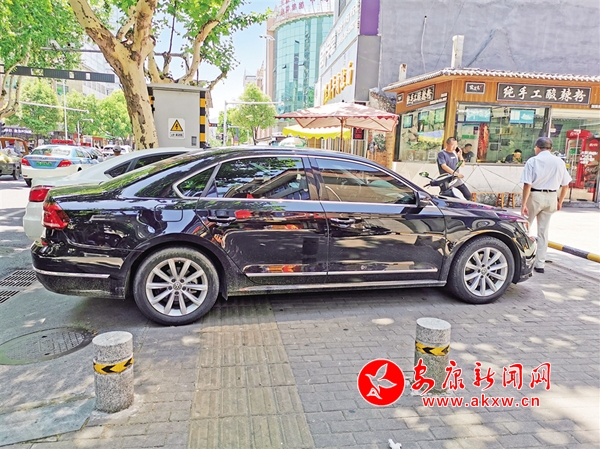 6月30日,在漢濱區(qū)鼓樓街興安中路十字,汽車、摩托車占用人行道,給行人帶來不便。(記者 潘潤生 攝)
