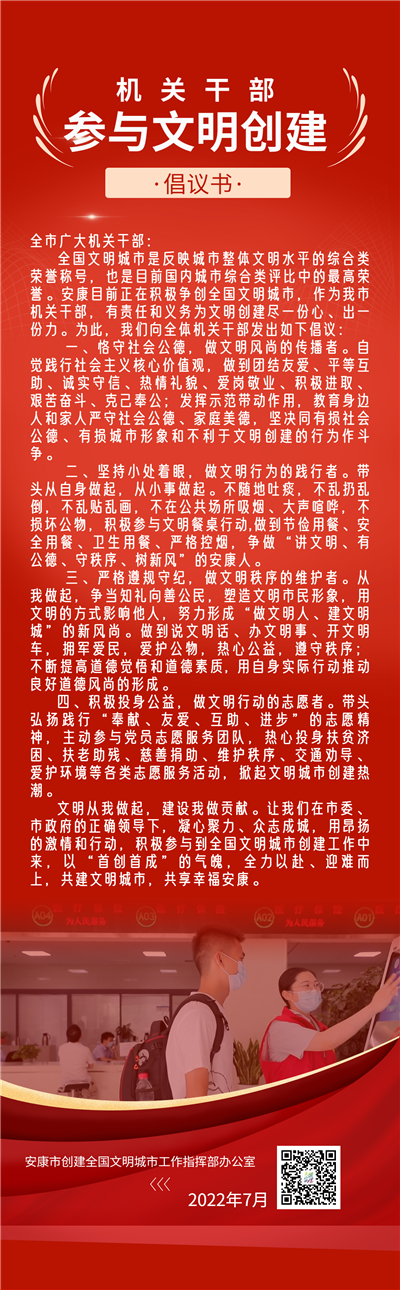 全國文明城市是反映城市整體文明水平的綜合類榮譽稱號,也是目前國內城市綜合類評比中的最高榮譽。安康目前正在積極爭創(chuàng)全國文明城市,作為我市機關干部,有責任和義務為文明創(chuàng)建盡一份心、出一份力。為此,我們向全體機關干部發(fā)出如下倡議: