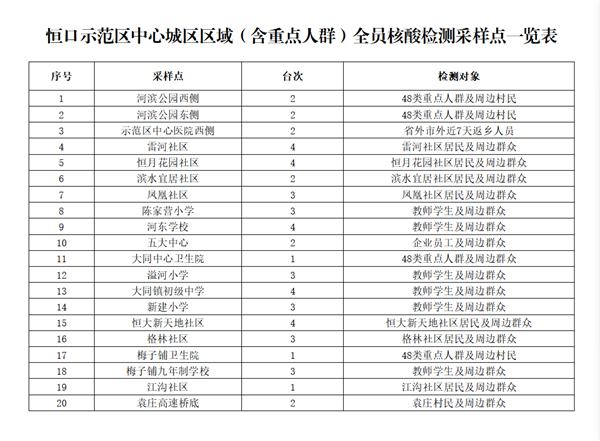 共設(shè)置20個(gè)采樣點(diǎn)、53個(gè)采樣臺(tái)(見附件),由相關(guān)責(zé)任單位統(tǒng)一負(fù)責(zé)采樣點(diǎn)設(shè)置、人員組織、秩序維護(hù),檢測對象按現(xiàn)場工作人員要求,有序到指定地點(diǎn)進(jìn)行采樣,避免人員聚集。