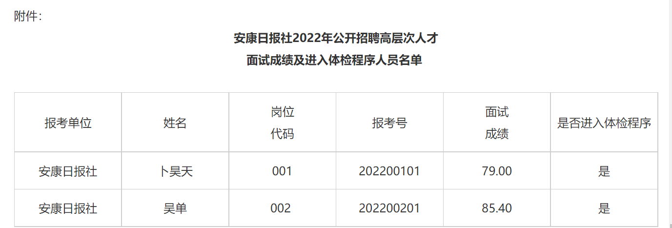 根據(jù)《安康日報社2022年公開招聘高層次人才公告》規(guī)定,現(xiàn)將安康日報社2022年公開招聘高層次人才面試成績及進入體檢程序人員名單(見附件)、體檢有關事項,公告如下: