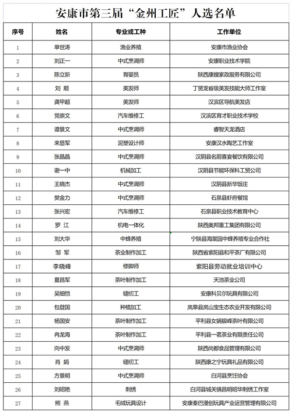 安康市第三屆“金州工匠”人選公示
