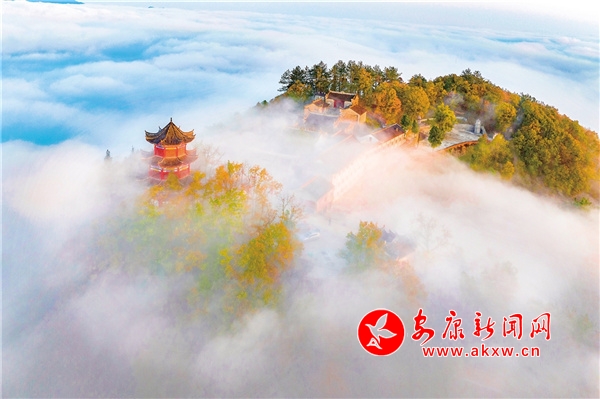 天柱山最美不過(guò)秋色,也是我在四季當(dāng)中頻繁上山的季節(jié)。每逢秋天,這里紅黃綠相間,漫山掛彩,在藍(lán)天的映襯下,多了幾分浪漫。從國(guó)道211起點(diǎn)的兩條上山公路,由數(shù)個(gè)“之”字連接起來(lái),從湖邊一直盤(pán)旋至山頂?shù)陌自乒潘?,遠(yuǎn)眺仿佛一個(gè)大大的“人”字形飄帶。雨后放晴的頭兩個(gè)早晨,在云霧的籠罩下,天柱山的下半身連同湖面一并被巨大的“蠶絲被”覆蓋,山的上半身或山頭浮在云海之上,像是茫茫大海上的一座孤島。