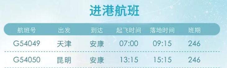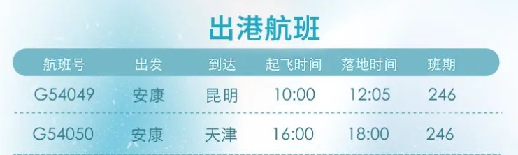 12月26日起,安康富強(qiáng)機(jī)場(chǎng)新增“安康=昆明”“安康=天津”航線。具體航線航班如圖: