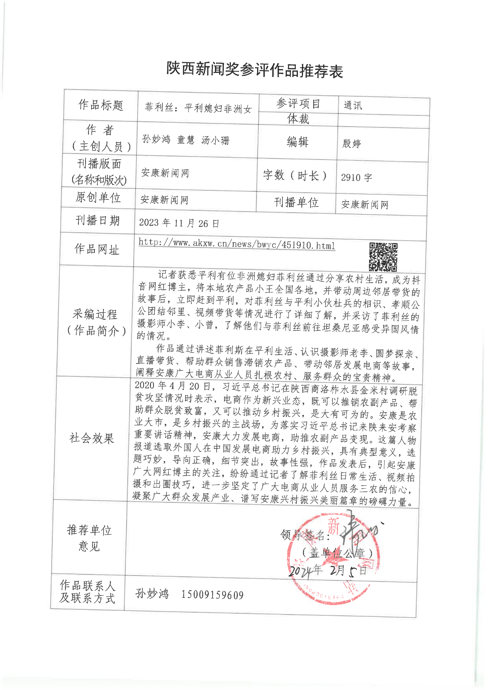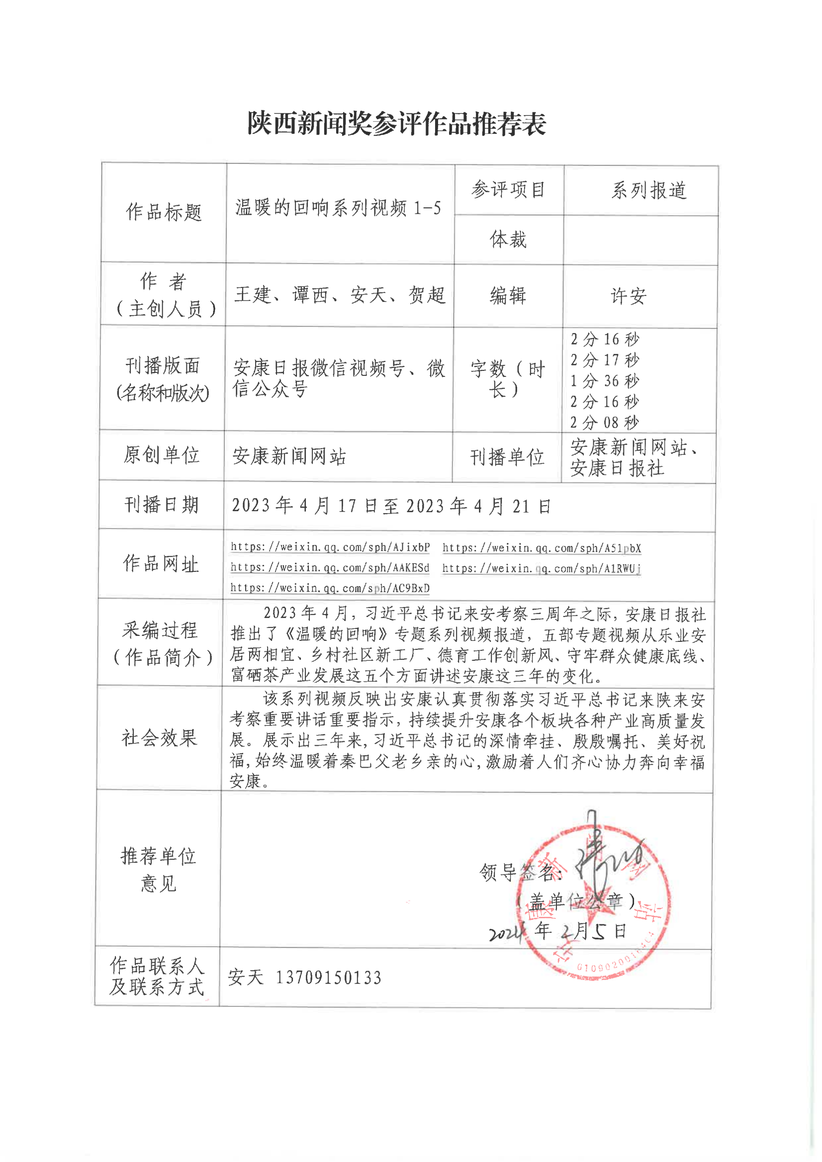 經(jīng)過1月30日編委會推薦、社黨委研究決定,擬推薦以下4件新聞作品參評2023年度“陜西新聞獎”。公示時間從2024年3月6日至2024年3月12日,公示期為5個工作日。如有不同意見,請向安康日報社機關(guān)紀委、新聞管理部反映。