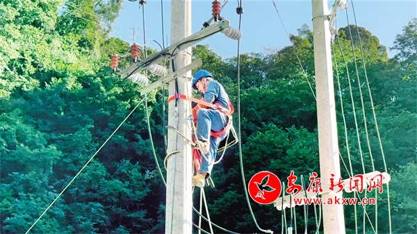 電力工人在滔漳線葵花支線施工現(xiàn)場(chǎng)安裝變壓器。 胡佳恒 攝