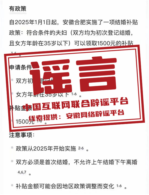 真相:近日,有網民發(fā)布消息稱“自2025年1月1日起,安徽合肥實施結婚補貼政策”“初次結婚登記可以領取1500元補貼”“下載相關APP即可領補貼款”,引發(fā)關注。對此,合肥市民政局發(fā)布聲明稱,網傳消息為謠言。合肥市并未研究、出臺有關結婚登記的補貼政策,望廣大網民注意甄別。(來源:“安徽省互聯(lián)網違法和不良信息舉報”微信公眾號)