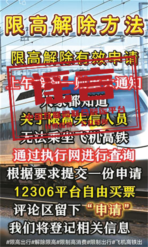 真相:近日,一些短視頻平臺頻現所謂“限高令新政”信息,宣稱“有內部途徑,被限制高消費人員不用還款也能正常買機票、高鐵票”,引發(fā)關注。對此,最高人民法院執(zhí)行局相關負責人表示,關于“新政”一說實屬謠言。各級人民法院從未出臺過解除限制消費措施,或為不償還債務的限高人員提供長期“解限”的相關規(guī)定。網上關于對不履行生效法律文書確定義務的被執(zhí)行人解除限制消費措施等內容均為不實信息。(來源:北京青年報)