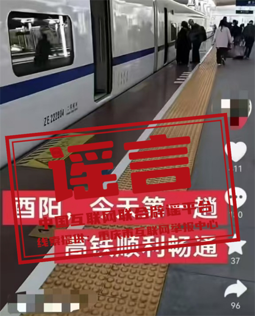 真相:近日,某網(wǎng)民在互聯(lián)網(wǎng)平臺發(fā)布信息稱“酉陽,今天第一趟高鐵順利暢通”,引發(fā)關(guān)注。經(jīng)核實(shí),網(wǎng)傳信息系謠言,酉陽縣暫未建成高鐵站。根據(jù)建設(shè)計(jì)劃,黔吉高鐵重慶段將于年內(nèi)開工建設(shè),線路貫穿黔江區(qū)、酉陽縣、秀山縣三地,線路全長約224.2km,全線設(shè)置車站3座,整個(gè)建設(shè)工期大概5年左右,預(yù)計(jì)在2030年之前全面建成通車。目前,警方已對造謠者展開調(diào)查。(來源:“重慶辟謠”微信公眾號)