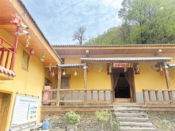 藍(lán)天、白云、清風(fēng)、朗日、松林……一切慵懶舒適得剛剛好。一路盤繞,繞道幾彎桃紅柳綠、野花盛開的山道,掠過桃紅李白郁郁蔥蔥的樹林,周家院子便毫無征兆地映入眼簾。隔墻遠(yuǎn)瞧,院內(nèi)房屋呈L形鋪展開來,房梁上懸掛的金黃色玉米穗、燦若紅霞的辣椒展示著農(nóng)家物產(chǎn)豐饒的鄉(xiāng)野特色,犁彎、犁脖、犁鏵,述說著院子主人的勤勞與殷實(shí)。而一串串醒目的大紅燈籠,展示著主人的幸福生活和對未來的美好憧憬。