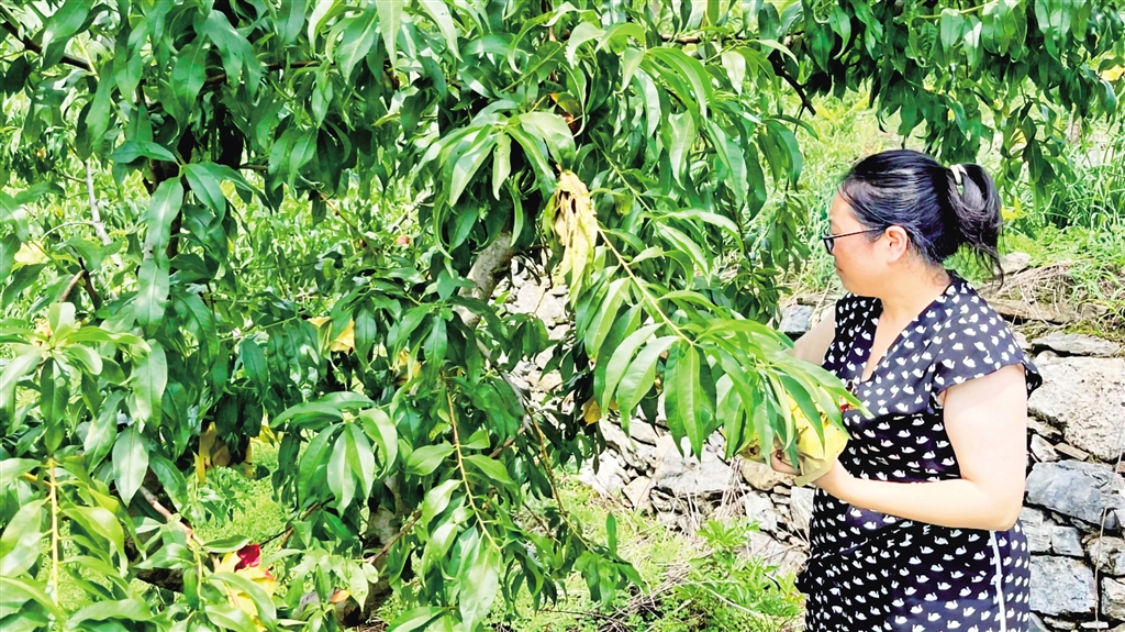 穿過村莊,山坡上500畝桃園綠意盎然。基地負(fù)責(zé)人伍娟與工人正采摘套袋?!?017年建設(shè)的桃園,今年雖受旱情影響,產(chǎn)量仍達(dá)30萬斤,產(chǎn)值約300萬元?!?o:p>