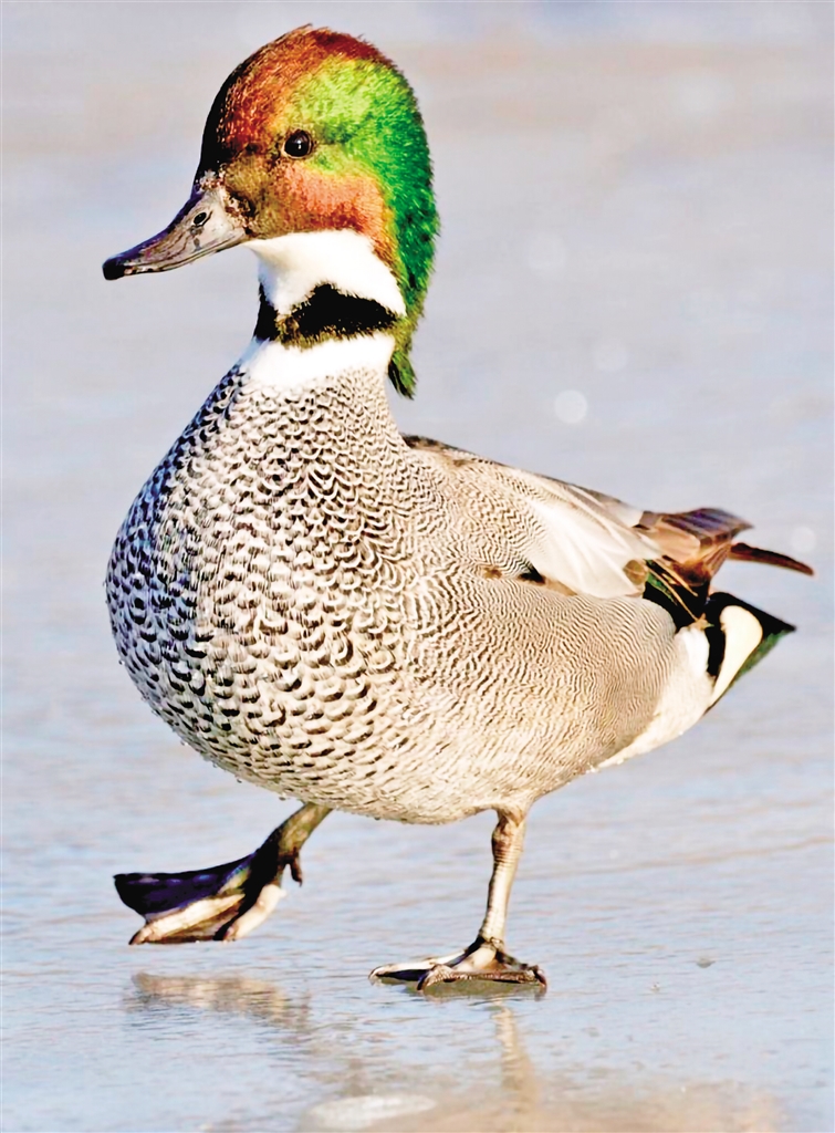 又名葭鳧、鐮刀鴨、扁頭鴨、早鴨、三鴨。雄鳥(niǎo)頭頂至后頸栗色,頭側(cè)及冠羽銅綠色;前頸基部有一黑色領(lǐng)環(huán),上體淺灰色,密布暗褐色波狀細(xì)紋;翼鏡綠黑色,三級(jí)飛羽延長(zhǎng)呈鐮狀;胸黑色密布白色新月形斑,尾下覆羽絨黑色;兩側(cè)具乳黃色斑塊,腋下白色;雌鳥(niǎo)體羽多黑褐色而具黃褐色羽緣,形成明顯的“V”形斑;虹膜褐色,嘴黑灰色,腳暗灰色。因胸、腹、脅部密布由大漸小的黑白波紋,排列成有序的特異圖案,形似編織物而故名。