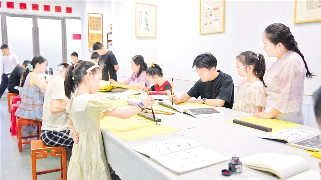 “我們來看下這‘?!郑亲笥医Y(jié)構(gòu)的字,左邊的偏旁是一個三點水,三點水寫的時候要注意連貫性……”書法老師細致地拆解著漢字的書寫技巧,耐心指導著現(xiàn)場的每一位學員。