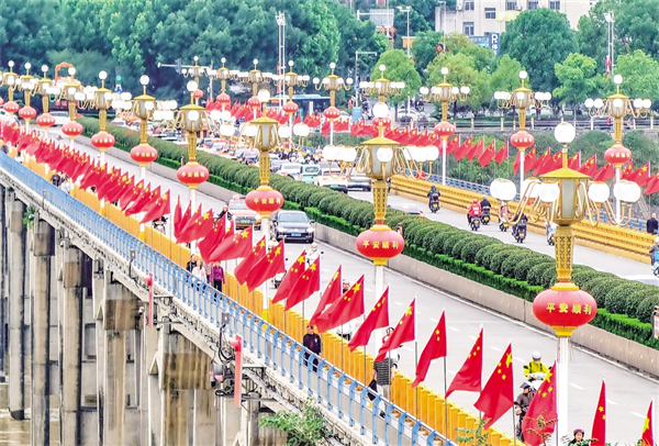 9月25日,我市市政部門對(duì)漢江一橋進(jìn)行了裝扮,以迎接即將到來(lái)的國(guó)慶節(jié)。?陳德模 攝