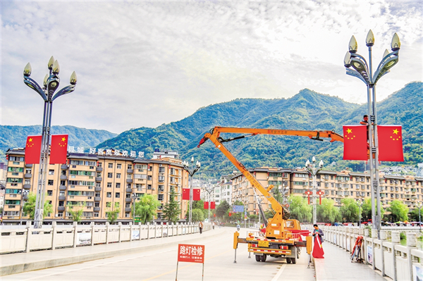 9月25日,紫陽(yáng)縣城區(qū)橋溝路的大道上,工人正在懸掛國(guó)旗。?彭召伍 攝