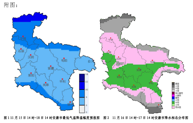 受冷空氣影響,15—17日全市過程日最低氣溫下降8~10℃,最低氣溫將出現(xiàn)在18日和19日清晨,全市大部會(huì)出現(xiàn)今冬初霜凍。預(yù)計(jì)最低氣溫:川道地區(qū)-4~2℃,中高山地區(qū)-8~-4℃,秦巴高山局地低于-8℃。16日夜間至17日白天我市大部有明顯吹風(fēng)天氣,陣風(fēng)可達(dá)5—6級(jí)。
