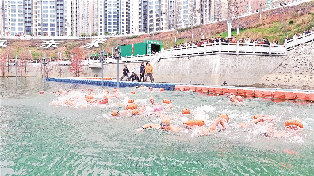 12月21日,陜西省第八屆漢江公開水域冬泳賽在紫陽縣月畔灣廣場水域舉行。當(dāng)天,來自陜西、湖北、四川、重慶、河南、內(nèi)蒙古自治區(qū)的44支代表隊400余名運(yùn)動員報名參賽。(儲茂銀 攝)