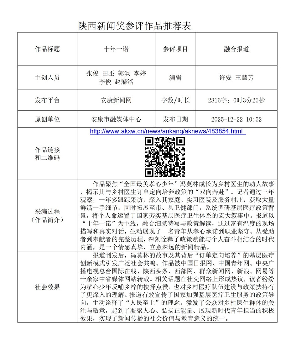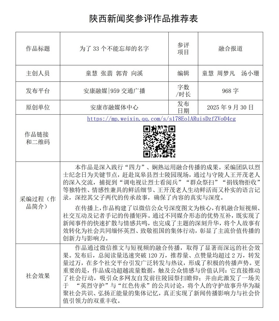 根據(jù)《陜西新聞獎(jiǎng)、陜西省優(yōu)秀新聞工作者評選辦法》和《關(guān)于開展2025年度陜西新聞獎(jiǎng)融合報(bào)道、應(yīng)用創(chuàng)新和新媒體新聞專欄作品推優(yōu)工作的通知》要求,經(jīng)個(gè)人申報(bào)、部門推薦和中心編委會(huì)嚴(yán)格篩選,對以下3件2025年度陜西新聞獎(jiǎng)融合報(bào)道、應(yīng)用創(chuàng)新、新媒體新聞專欄參評作品進(jìn)行公示。(作品推薦表附后)