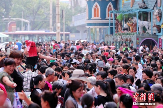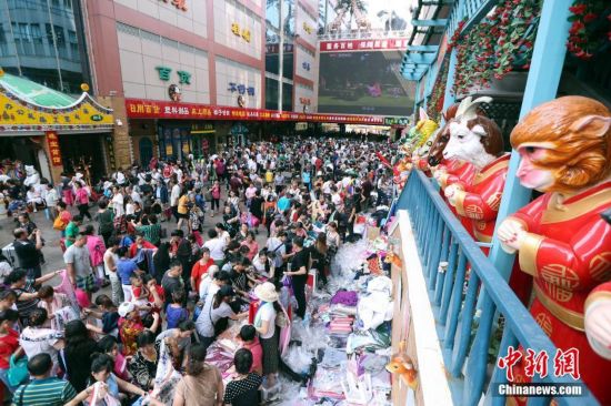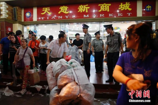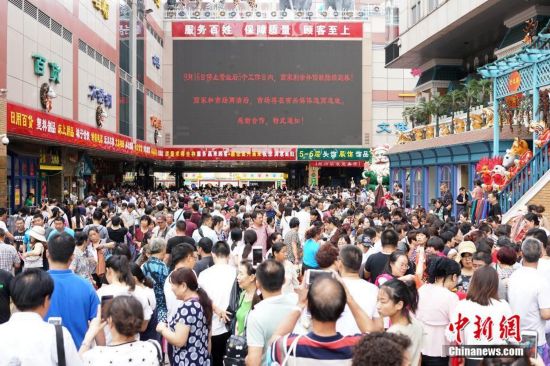 9月15日,商戶聚集在北京天意商城門口甩賣商品,吸引大批顧客搶購。天意商城是北京規(guī)模最大的小商品批發(fā)兼零售市場,為疏解北京非首都功能,天意商城將于9月16日關門停業(yè)。中新社記者 盛佳鵬 攝JgP安康新聞網(wǎng)