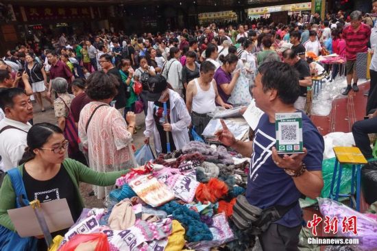 9月15日,天意商戶舉起二維碼方便顧客掃碼支付,以新式支付方式助力傳統(tǒng)零售。當日,自1992年開業(yè)至今的北京天意市場迎來其在北京西城阜外大街營業(yè)的最后一日,商家趁機“瘋狂甩貨”,大批北京民眾也紛至沓來。這里曾是北京著名的小商品商城,聚集了數(shù)千家商戶。為疏解北京非首都功能,天意商城將于本月16日關門停業(yè)。中新社記者 崔楠 攝JgP安康新聞網(wǎng)