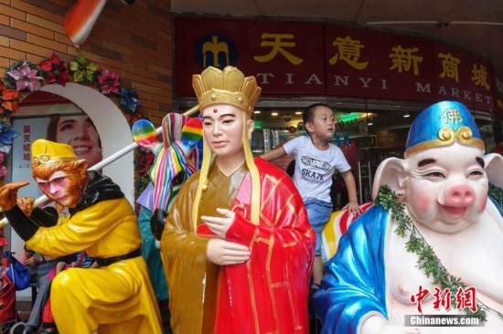 9月15日,一孩童坐在天意門前西游記師徒雕像上遠眺。當日,自1992年開業(yè)至今的北京天意市場迎來其在北京西城阜外大街營業(yè)的最后一日,商家趁機“瘋狂甩貨”,大批北京民眾也紛至沓來。這里曾是北京著名的小商品商城,聚集了數(shù)千家商戶。為疏解北京非首都功能,天意商城將于本月16日關門停業(yè)。中新社記者 崔楠 攝JgP安康新聞網(wǎng)
