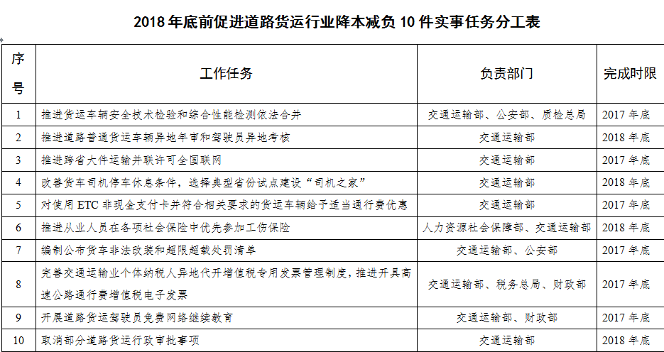 2018年底前,完成降本減負(fù)10件實事(見附件),推動政策落地并取得實質(zhì)性進(jìn)展。制度性交易成本大幅降低,貨車司機(jī)生產(chǎn)生活條件顯著改善,貨運業(yè)戶的獲得感和貨車司機(jī)的歸屬感持續(xù)增強(qiáng),行業(yè)平穩(wěn)發(fā)展的基礎(chǔ)更加牢固。