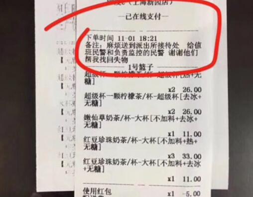 民警四處詢問了下,沒人下過單,快遞小哥連忙遞上手中的外賣單,上面寫著:麻煩送到派出所接待處,給值班民警和負責監(jiān)控的民警,謝謝他們幫我找回失物。