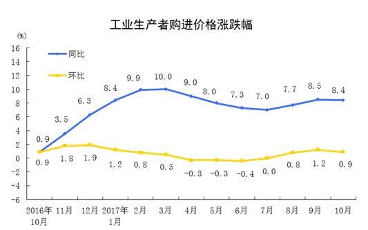 人民網(wǎng)北京11月9日電(李楠樺)國家統(tǒng)計(jì)局官方網(wǎng)站公布數(shù)據(jù)顯示,2017年10月份,全國工業(yè)生產(chǎn)者出廠價(jià)格同比上漲6.9%,環(huán)比上漲0.7%。工業(yè)生產(chǎn)者購進(jìn)價(jià)格同比上漲8.4%,環(huán)比上漲0.9%。1-10月平均,工業(yè)生產(chǎn)者出廠價(jià)格同比上漲6.5%,工業(yè)生產(chǎn)者購進(jìn)價(jià)格同比上漲8.4%。qYM安康新聞網(wǎng)