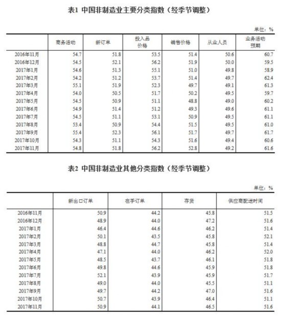 人民網(wǎng)北京11月30日電 據(jù)國(guó)家統(tǒng)計(jì)局網(wǎng)站消息,2017年11月份,中國(guó)非制造業(yè)商務(wù)活動(dòng)指數(shù)為54.8%,比上月上升0.5個(gè)百分點(diǎn),持續(xù)位于擴(kuò)張區(qū)間,非制造業(yè)延續(xù)平穩(wěn)較快的增長(zhǎng)態(tài)勢(shì),增速有所加快。