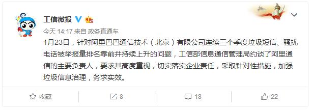 人民網(wǎng)北京1月24日電 據(jù)工業(yè)和信息化部信息中心官微@工信微報(bào)消息,昨日,針對(duì)阿里巴巴通信技術(shù)(北京)有限公司連續(xù)三個(gè)季度垃圾短信、騷擾電話被舉報(bào)量排名靠前并持續(xù)上升的問題,工信部信息通信管理局約談了阿里通信的主要負(fù)責(zé)人,要求其高度重視,切實(shí)落實(shí)企業(yè)責(zé)任,采取針對(duì)性措施,加強(qiáng)垃圾信息治理,務(wù)求實(shí)效。(朱江)