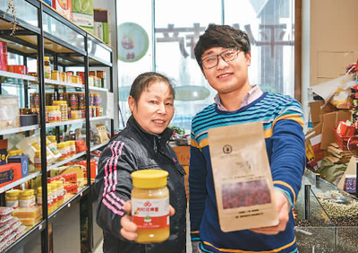 | 大學(xué)畢業(yè)后回到家鄉(xiāng)創(chuàng)辦電商公司的張偉和母親在新疆精河縣線(xiàn)下實(shí)體店展示自家出售的特產(chǎn)。 |