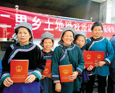 圖為3月14日,在貴州省榕江縣仁里鄉(xiāng)黨民村舉行的土地確權(quán)頒證儀式上,當(dāng)?shù)貗D女領(lǐng)到《農(nóng)村土地承包經(jīng)營權(quán)證》。