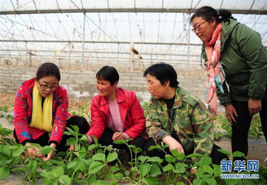 楊育英(左一)在自家果蔬大棚內(nèi)與員工交流育苗技術(shù)(3月20日攝),F(xiàn)年45歲的楊育英早前并不從事農(nóng)業(yè)。她19歲開(kāi)始到北京打工,先是做推銷員,后來(lái)專門(mén)從事設(shè)施農(nóng)業(yè)設(shè)備的生產(chǎn)?吹皆O(shè)施農(nóng)業(yè)前景廣闊,她2008年帶著技術(shù)和資金回到陜西渭南老家,搞起了葡萄種植。建大棚、配設(shè)施、引苗木,很快她就建起了渭南裕美現(xiàn)代農(nóng)業(yè)設(shè)施示范園,并先后引進(jìn)了36個(gè)葡萄品種。問(wèn)起成功的秘訣,她坦言得益于她的“朋友圈”。新華社發(fā)(張博文 攝)