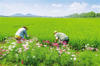 4月2日,博鰲國家農(nóng)業(yè)公園內(nèi),繁花盛開,水稻郁郁蔥蔥,農(nóng)戶在地里忙碌著。本報(bào)記者 袁琛 攝