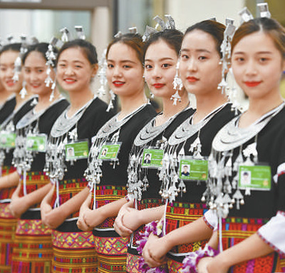 | 身著黎族服飾的博鰲亞洲論壇志愿者準(zhǔn)備迎接嘉賓。 |