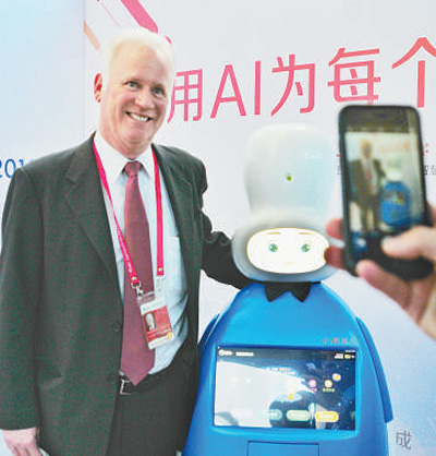 | 4月9日,清潔能源論壇首席執(zhí)行官薄銳思在體驗(yàn)互動(dòng)后與小i機(jī)器人合影。 |