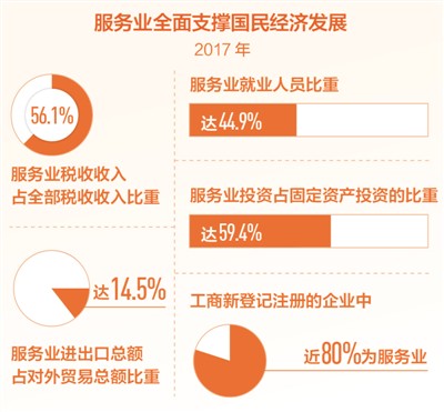 服務業(yè)已成為稅收的主要來源。2017年,服務業(yè)稅收收入占全部稅收收入比重為56.1%,比上年增長9.9%,連續(xù)5年對稅收收入貢獻過半。