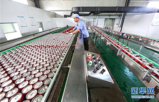 5月2日,江西廣昌一家食品公司的工人在罐裝荷葉茶生產(chǎn)線(xiàn)上忙碌。