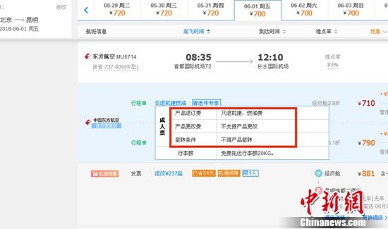 記者在攜程網(wǎng)上預(yù)訂6月1日北京到昆明的東方航空MU5714票價(jià)為710元(2.8折),顯示“只退機(jī)建、燃油費(fèi)”“不支持產(chǎn)品更改”。