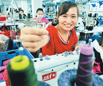 江西省鄱陽縣石門街鄉(xiāng)農(nóng)家服飾是一個(gè)年出口50萬件各類服飾的民營企業(yè)。近年來,企業(yè)專門加工制造各類服裝,俏銷非洲各國,實(shí)現(xiàn)年產(chǎn)值2000多萬元。圖為石門街鄉(xiāng)農(nóng)家女工正在趕制出口的服飾。
