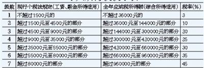 修正案草案將工資、薪金,勞務(wù)報酬,稿酬和特許權(quán)使用費等4項勞動性所得(下稱“綜合所得”)納入綜合征稅范圍,適用統(tǒng)一的超額累進稅率。綜合所得適用3%至45%的超額累進稅率。