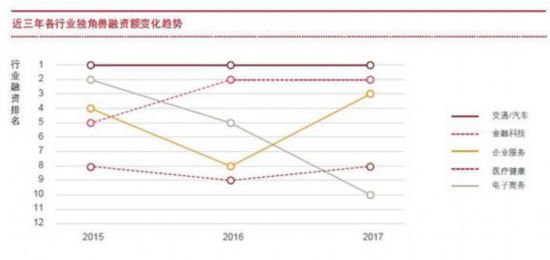 2017年,獨(dú)角獸公司年度融資總額排在前三位的行業(yè)是交通汽車(chē)、金融科技和企業(yè)服務(wù)。其中,交通汽車(chē)和金融科技領(lǐng)域在最近三年一直受到投資機(jī)構(gòu)和投資人的熱捧。
