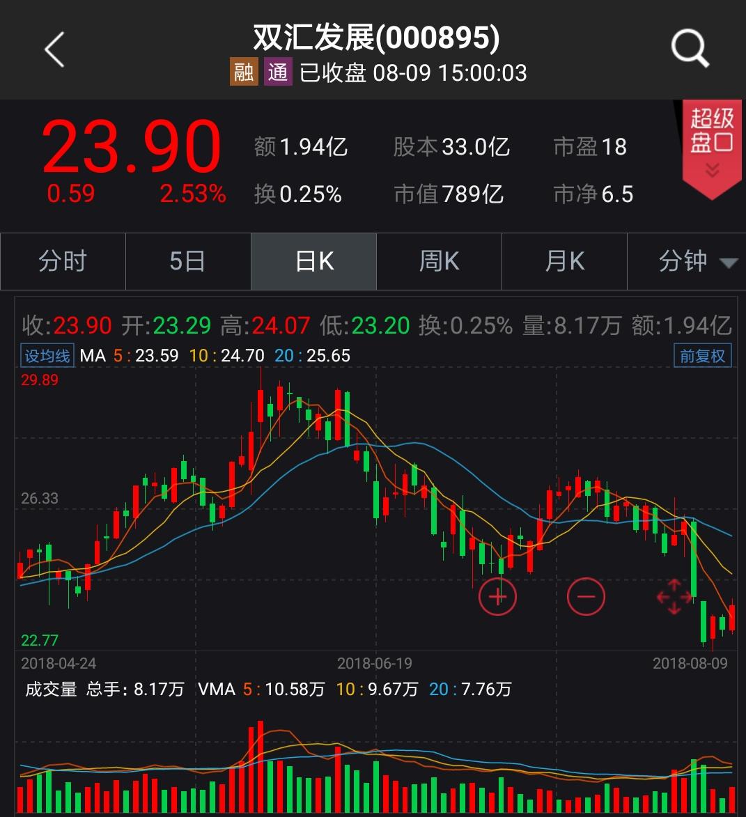 中新經(jīng)緯客戶端8月10日電 (吳亦涵)在遼寧省發(fā)生的豬瘟疫情被確診為非洲豬瘟之后,雙匯發(fā)展股價連日下跌,盡管8月9日,雙匯發(fā)展的股價在大盤帶動下有所反彈(截至收盤上漲2.53%,報23.90元/股),但是其5日股價漲跌幅仍舊下跌8.08%。較其今年5月31日29.89元/股的高位相比,雙匯發(fā)展股價已經(jīng)下跌接近三成。