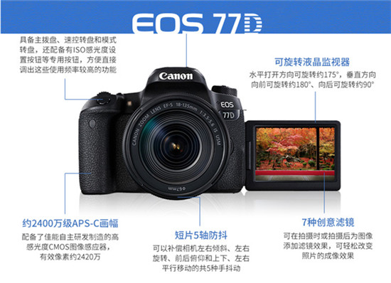 最后,不得不提的佳能77D,雙套對(duì)焦系統(tǒng)的高性能單反機(jī),攝影愛好者的新選擇,專業(yè)的操作系統(tǒng)實(shí)用便捷的相機(jī)設(shè)計(jì),雙核自動(dòng)對(duì)焦5軸防抖,內(nèi)置WiFi/NFC/藍(lán)牙,照片及時(shí)分享,兼顧了便攜的體積與專業(yè)的操控,同時(shí)在機(jī)身性能上也有著不俗的配置。而在畫質(zhì)、控噪方面,77D同樣有著良好的表現(xiàn)。