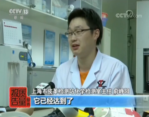 上海市皮革檢測站化學檢測室主任 俞崢陽:正常情況下,我們是100毫克每千克是不合格,它已經達到了將近達到了400毫克每千克。