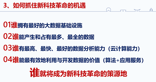 這一次新的科技革命,誰成為它的策源地,誰就會(huì)成為科技強(qiáng)國,這個(gè)也是十九大習(xí)近平總書記給我們提出的要求,到2050年中國要成為科技強(qiáng)國。要想成為科技策源地主要的競爭將會(huì)在四個(gè)層面展開:第一,誰擁有最好的大數(shù)據(jù)基礎(chǔ)設(shè)施;第二,誰能產(chǎn)生和占有最多、最全的數(shù)據(jù);第三,誰有最高、最快、最好的數(shù)據(jù)分析能力;第四,誰能最有效地利用與開發(fā)數(shù)據(jù)的價(jià)值,假如在這四個(gè)層面我們?nèi)梢灶I(lǐng)先世界,我們就是新的科技革命的策源地。