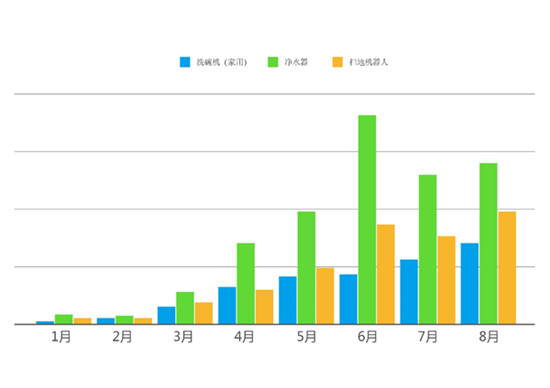 數(shù)據(jù)顯示,相較于1月,8月份凈水器在全國(guó)零售云店的銷量增長(zhǎng)1390%,洗碗機(jī)增長(zhǎng)1300%,掃地機(jī)器人增長(zhǎng)573%,吸塵器增長(zhǎng)490%,單反相機(jī)增長(zhǎng)400%。
