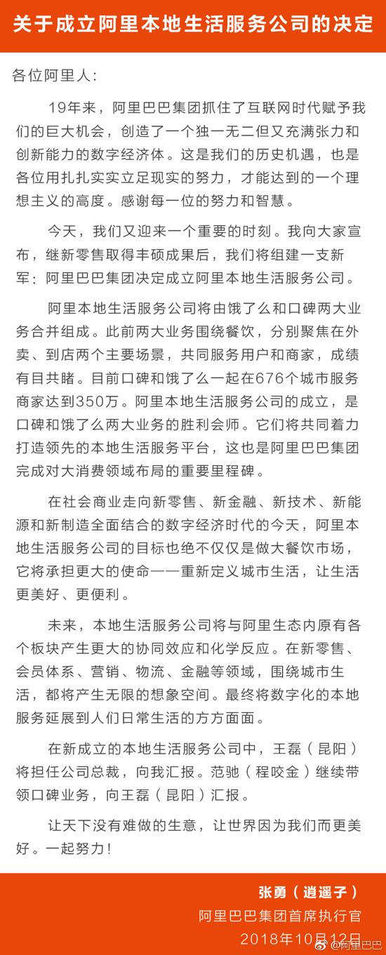 阿里CEO張勇在員工信中寫道:“在社會(huì)商業(yè)走向新零售、新金融、新技術(shù)、新能源和新制造全面結(jié)合的數(shù)字經(jīng)濟(jì)時(shí)代的今天,阿里本地生活服務(wù)公司的目標(biāo)也絕不僅僅是做大餐飲市場(chǎng),它將承擔(dān)更大的使命——重新定義城市生活,讓生活更美好、更便利!